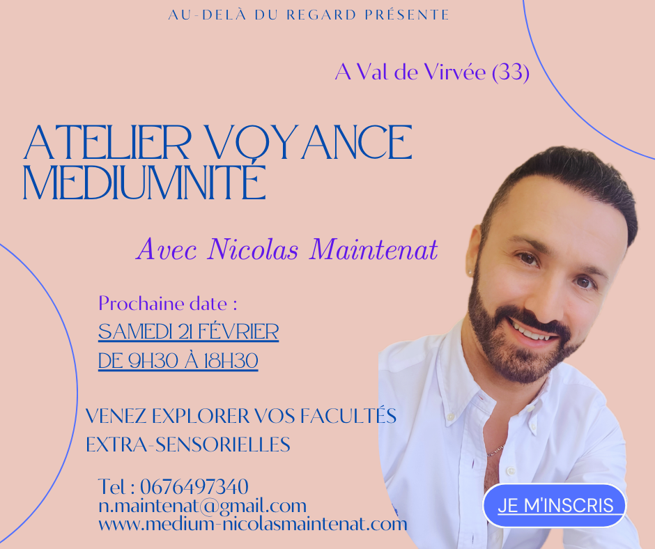 Je vous propose des ateliers axés sur la découverte et de le développement des capacités extra-sensorielles utiles à la pratique de la Voyance et de la Médiumnité. Je vous apporterai des connaissances et des outils de pratique pour vous aider au mieux à explorer ces facultés que nous possédons tous à des degrés divers. Débutants ou initiés, tout le monde est bienvenu du moment que vous êtes animés de bonnes intentions, avec une réelle envie d'apprendre et de découvrir.